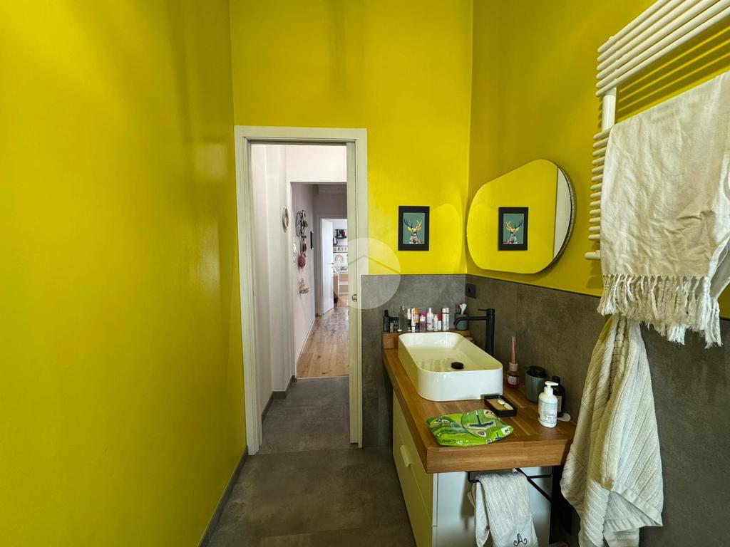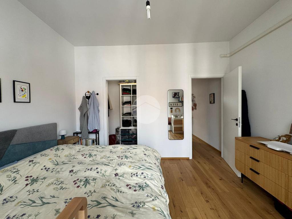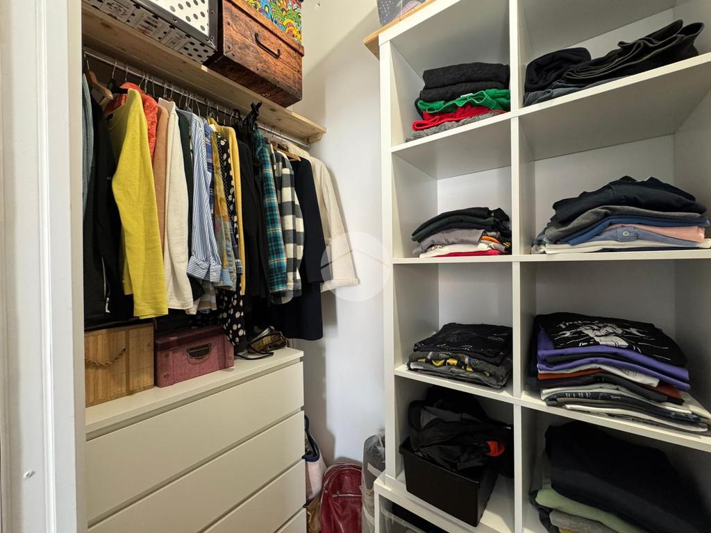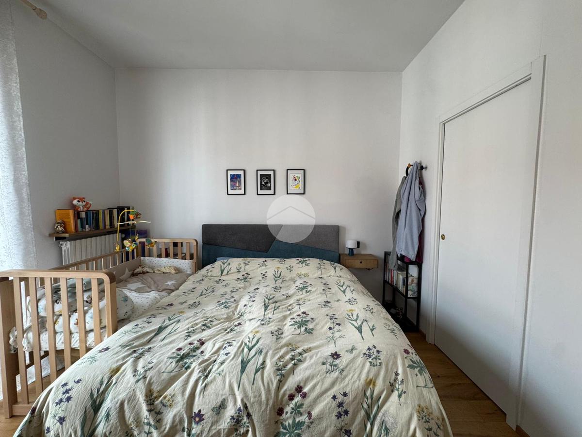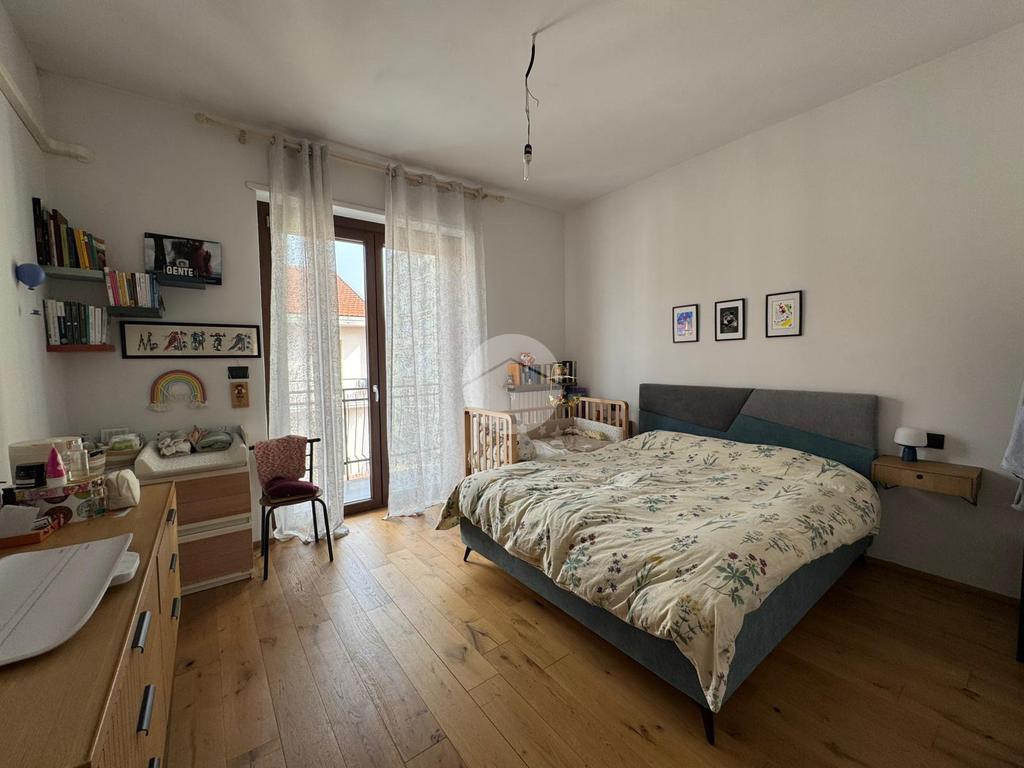 Il disimpegno conduce alla zona notte, caratterizzata da una camera da letto matrimoniale composta da cabina armadio con affaccio sul secondo balcone, e bagno finestrato completo di pratica zona lavanderia.